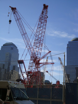After refilling our MetroCard (more on that later), we hopped on the subway again and rode up to the site of Ground Zero. I really can't describe how it feels to be there. We watched people rushing by and most of them don't even look over at the giant hole that Shelly and I couldn't take our eyes off of. There is a church with a cemetary right across the street. In the days after the Towers fell, St. Peter's Church became a refuge for those wanting to leave flowers at the gate and a place where firefighters and police officers could rest and find comfort. There is a memorial inside the church where friends and family members leave photos and personal objects in memory of those who lost their lives that day. The National 9/11 Memorial is under construction, as well as a new World Trade Center tower. Cranes and construction everywhere.